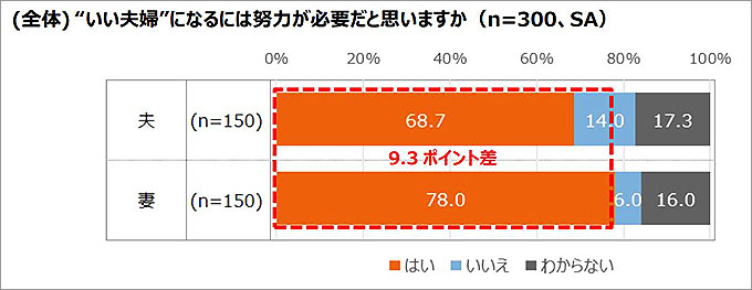 男女別にみると、経営者である夫68.7%、妻78.0%と、男女で9.3ポイントの差があり、夫よりもが妻の方が“いい夫婦“には努力が必要だと思っている人が多いという結果に。