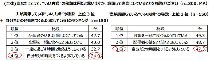 さらに、あなたにとって、“いい夫婦”の秘訣は何だと思うか、意識して実際にしていることを聞いたところ、全体では1位「配偶者の話をよく聞くようにしている」(全体45.7%、夫42.7%、妻48.7%)、2位「食事を一緒に食べるようにしている」(全体44.7%、夫40.0%、妻49.3%)、3位「自分だけの時間をつくるようにしている」(全体35.7%、夫24.0%、妻47.3%)という結果となり、男女別でみると順位に違いがあった。