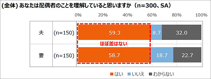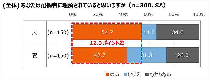 また、男女別でみると、配偶者のことを理解していると思うか聞いたところ、「はい」と回答したのは、夫59.3%、妻58.7%とほぼ男女差がないのに対して、配偶者に理解されていると思うか聞いたところ、「はい」と回答したのは、夫54.7%、妻42.7%と12ポイントの差があった。