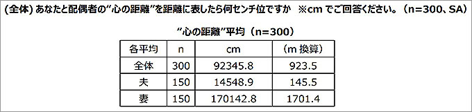 さらに、中小企業経営者150名と中小企業経営者の妻150名に、配偶者との“心の距離”について(距離に換算して)聞いたところ、全体の平均は923.5mと1km近い距離に。また、男女別でみると夫145.5mに対して、妻1701.4m(約1.7km)と11倍以上の差があった。