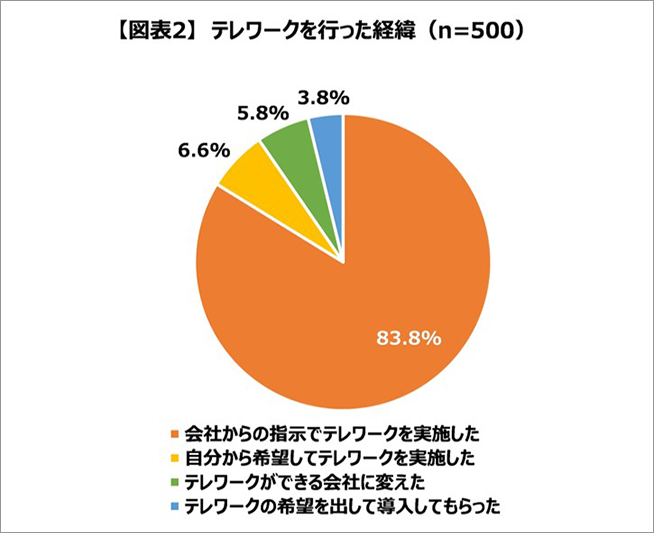 テレワークを行った経緯は会社からの指示が83.8%、コロナ禍での実施が多い
