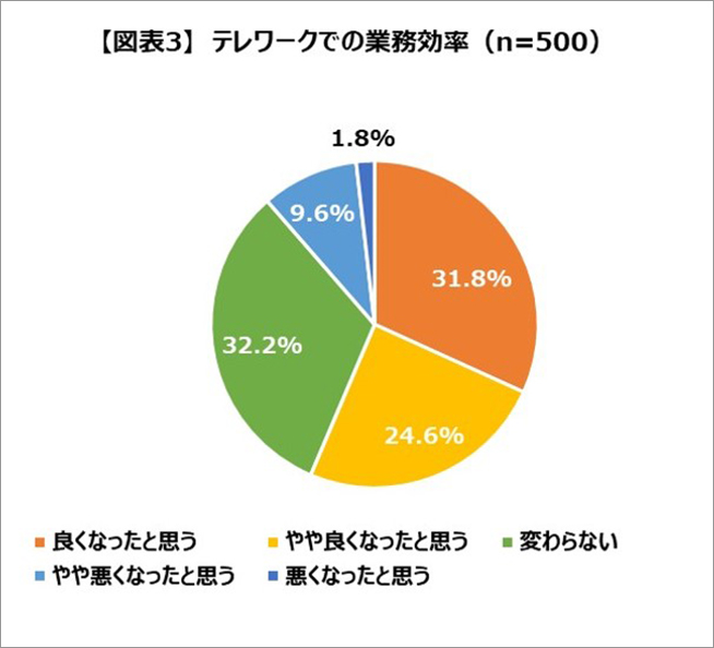 テレワークでの業務効率について聞くと、「良くなったと思う」31.8%、「やや良くなったと思う」24.6%と計56.4%が業務効率の向上を感じていた。