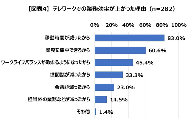 業務効率が上がった理由は「移動時間が減ったから」が83.0%で最も多く、「業務に集中できるから」60.6%、「ワークライフバランスが取れるようになったから」45.4%と続く結果となった。