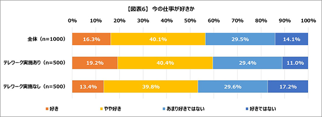 今の仕事が「好き」はテレワーク実施者が59.6%で、未実施者より6.4ポイント高い