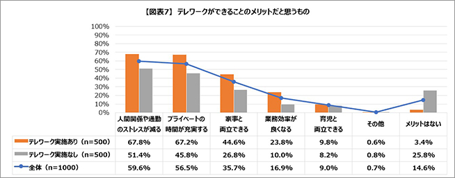 どの項目もテレワーク実施者が多く回答しており、そのメリットを実感していた。