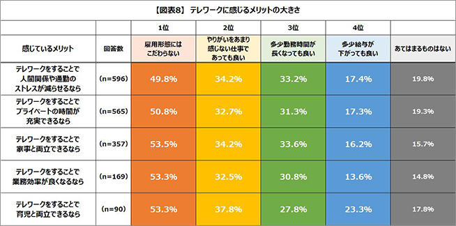また、このメリットがどれくらいのものか、他のものと比べてもらうと、テレワークで人間関係や通勤のストレスが減らせるなら、「雇用形態にはこだわらない」と回答した人が49.8%などと、何かしらと引き換えにしても良いと感じる人が8割以上いることがわかった。