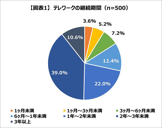 週に1日以上テレワークを実施する派遣社員500名に対し、テレワークの継続期間を聞くと、「2年~3年未満」と回答した人が最も多く39.0%。