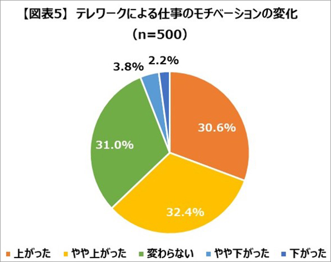 また、テレワークにより、仕事のモチベーションは計63.0%が「上がった」と回答し、テレワークが業務に与えるポジティブな影響が改めてわかる結果となった。