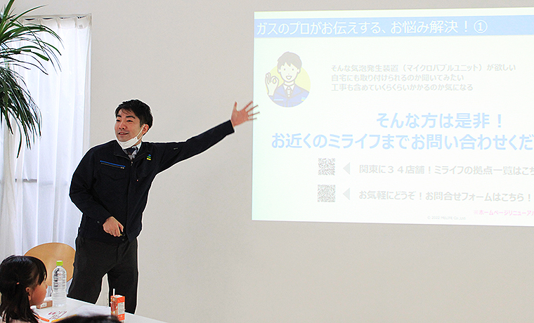 「マイクロバブル、ウルトラファインバブルなどをつけると、身体がめちゃめちゃあたたまる。しかも、リラックス効果や潤い効果、洗浄効果もある。こうした最新設備の詳細は、関東に34店舗あるミライフの拠点でチェックしてみて」と伝えていた。