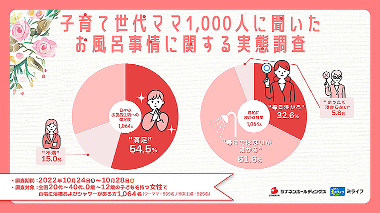 エネルギー・住まい・暮らしの総合サービス事業を提供するシナネンホールディングスと、その子会社で関東エリアにおいてLPガス・電気・灯油等のエネルギー販売事業を展開するミライフは、11月26日の「いい風呂の日」を前に、全国の子育て世代ママ約1,000人を対象に「お風呂事情に関する実態調査」を実施。その調査結果が興味深い。