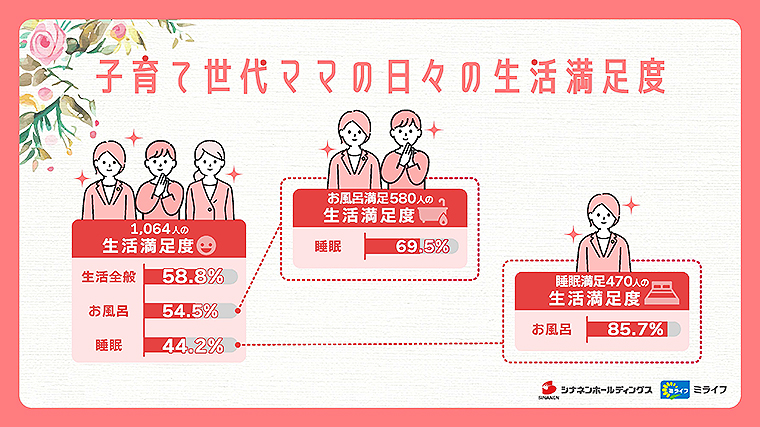 子育て世代ママの生活満足度は58.8%。お風呂生活満足度と睡眠満足度の間に関係性も