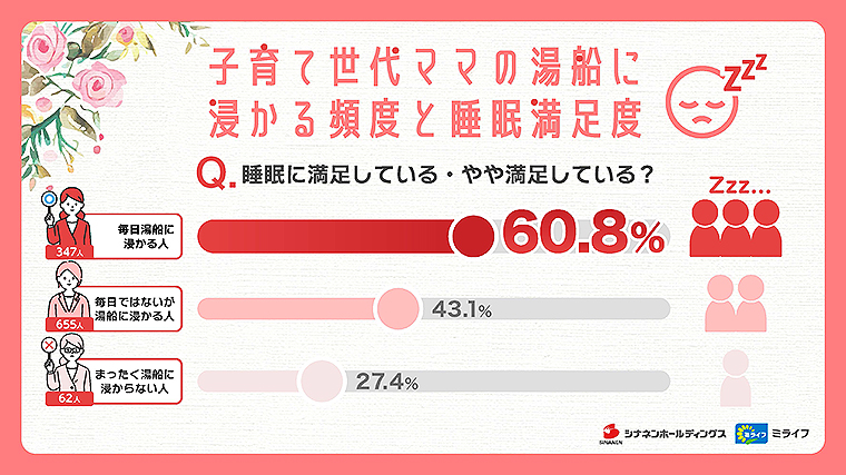 また、毎日湯船に浸かっているママ(n=347)と湯船に浸かる頻度が毎日ではないママ(n=655)、そして、まったく湯船には浸からないママ(n=62)の睡眠に関する満足度を見てみたところ、毎日湯船に浸かるママの睡眠満足度60.8%に対し、湯船に浸かる頻度が毎日ではないママは43.1%、まったく湯船には浸からないママは27.4%と、湯船に浸かる頻度が高いママは、睡眠への満足度も高い傾向が見られた。