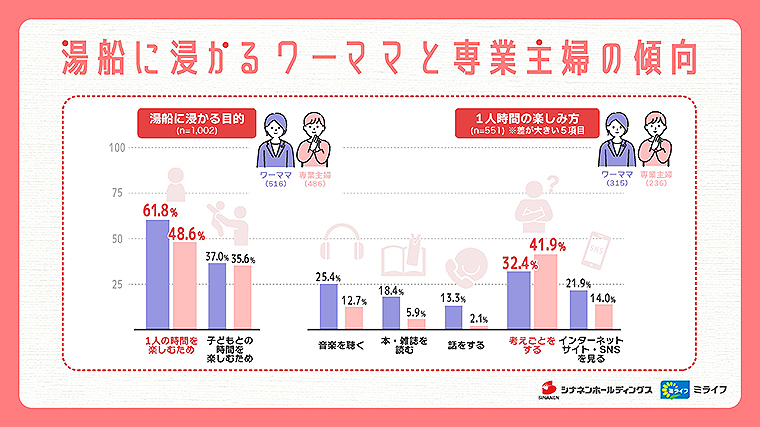 ワーママの6割が「1人の時間を楽しむため」に湯船に浸かり、専業主婦と湯船に浸かる時間の使い方に違い