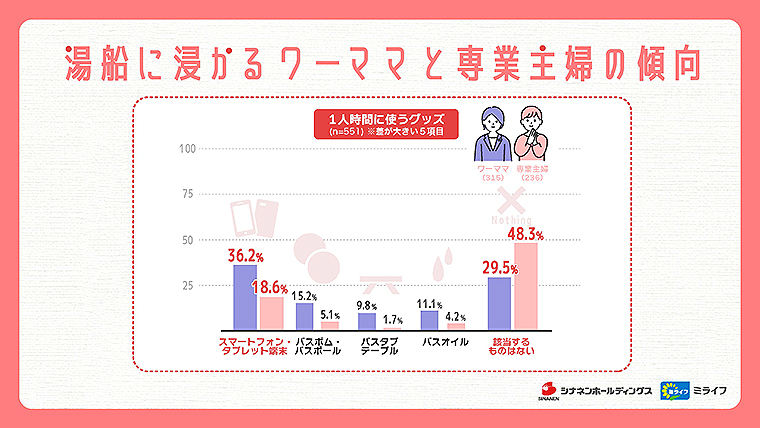 また、専業主婦との利用状況を比較すると、利用率の差は「スマートフォン・タブレット端末」が17.6%、「バスボム・バスボール」が10.1%、「バスタブテーブル」が8.1%と、ワーママの利用率が高く、専業主婦では、「該当するものはない」との回答が最多(48.3%)となった。