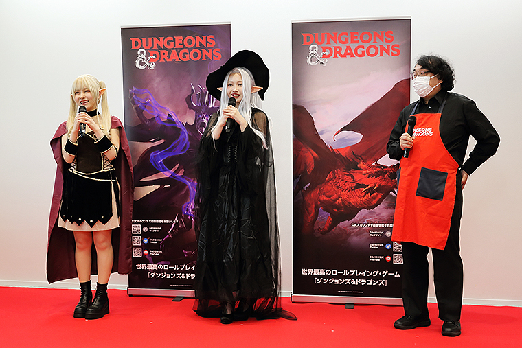その発表会には、ウィザーズ・オブ・ザ・コースト 田中ヒミー・岩崎宏美マーケティング担当、藤田竜也 営業担当、そしてコスプレイヤーえい梨・シスル、Fighter-KOUダンジョンマスターらが登壇し、その魅力を伝えた。