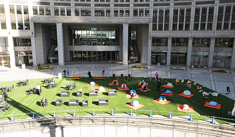 いつもは足早に通り過ぎていた超高層ビルまわりで、心地よい椅子に座って会話を楽しむなど、ゆったり過ごす時間を楽しんでみて。
