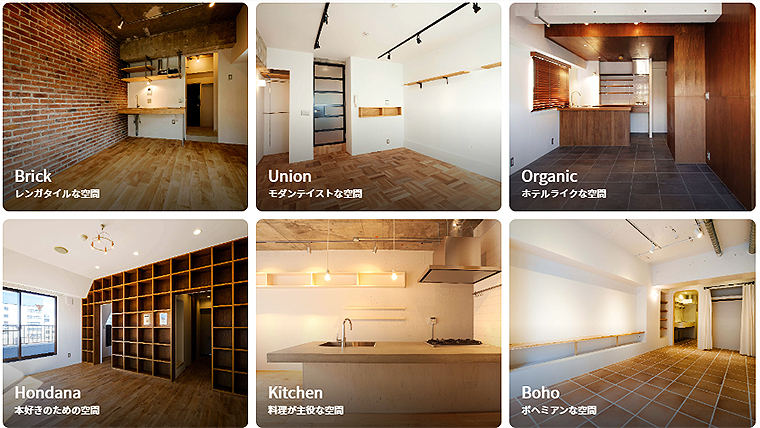このほかにも、侘び寂び、シャビーシック、土間と小上がり、真っ白、アクセントカラー、大人ガーリー、森の中の安らぎ……などなど個性的な賃貸物件居住空間を提供しているのが、REISM(リズム)。