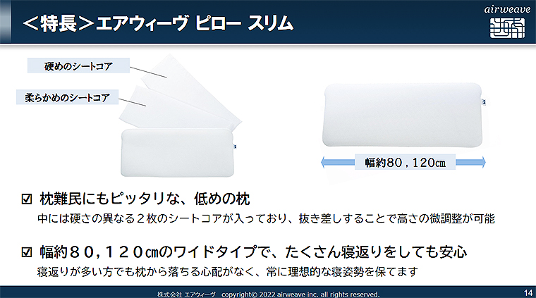 この「エアウィーヴ ピロー スリム」は、そうしたユーザー向けに設計した薄い枕で、これまで合う枕が見つからなかった人におすすめという。