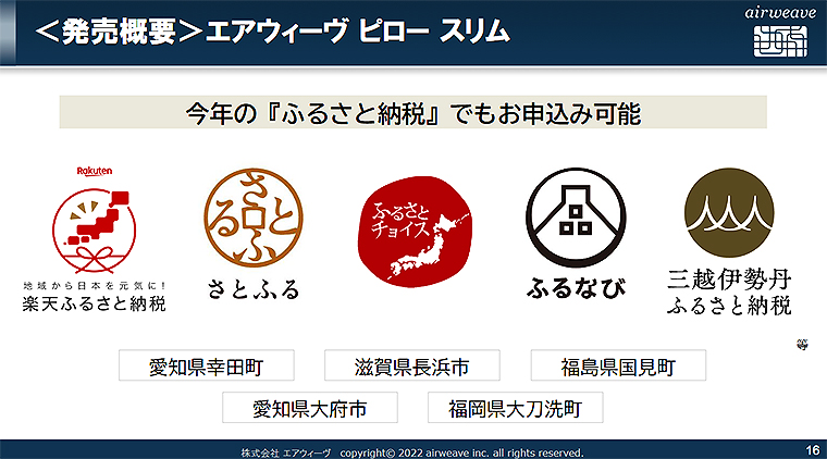 実はこの「エアウィーヴ ピロー スリム」は、エアウィーヴの拠点・工場などがある愛知県幸田町、滋賀県長浜市、福島県国見町、愛知県大府市、福岡県大刀洗町のふるさと納税返礼品にラインナップされているから、「納税してゲット」という選択肢もOK!