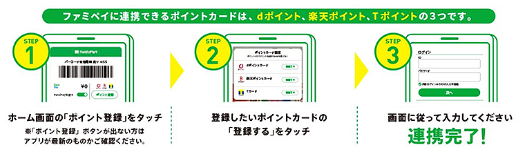 ポイントカード(dポイントカード・ 楽天ポイントカード・Tカード)を「ファミペイ」に連携し、ファミリーマートで「ファミペイ」のバーコードをレジでスキャンして200円(税込)以上買い物をすると、通常の2倍のポイントを進呈。
