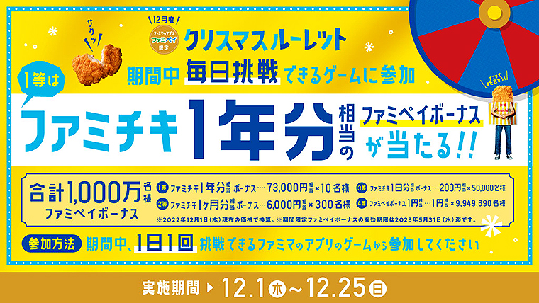 ―――ファミチキ先輩がテンション高めでそう誘うのは、「1等は“ファミチキ1年分”相当! 総勢1,000万名にファミペイボーナスが当たるファミマアプリ「ファミペイ」限定クリスマスルーレット」だ!