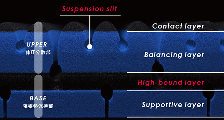 しなやかにボディラインにフィットする柔軟性と、しっかり身体を支える硬度、寝返りしやすい高弾力性を兼ね備えたハイブリッド4層構造で、表面の1680個(シングルサイズの場合)の点が体を受け止め体圧を分散。
