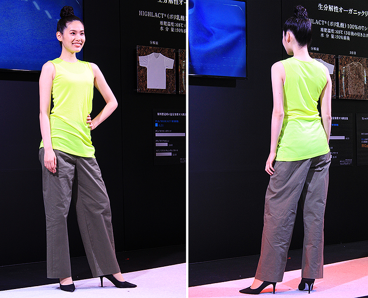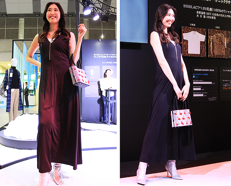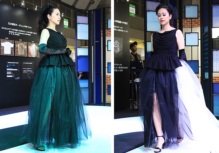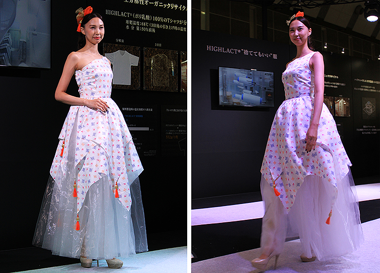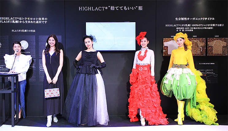 なぜ繊維業界関係者などのプロが、このファッションショーで驚きの表情をみせていたかというと、実はトウモロコシ由来の PLA(ポリ乳酸)は、発色が苦手という常識を、このハイラクトがひっくり返しちゃったから。