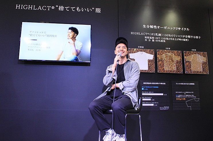 エコプロ2022 ハイケム ブースでは、こうしたファッションショーのほか、ハイケム サステナベーション本部 本部長 高裕一取締役も登場。「捨ててもいい服」への想いを語った。