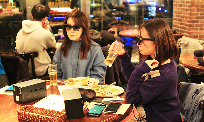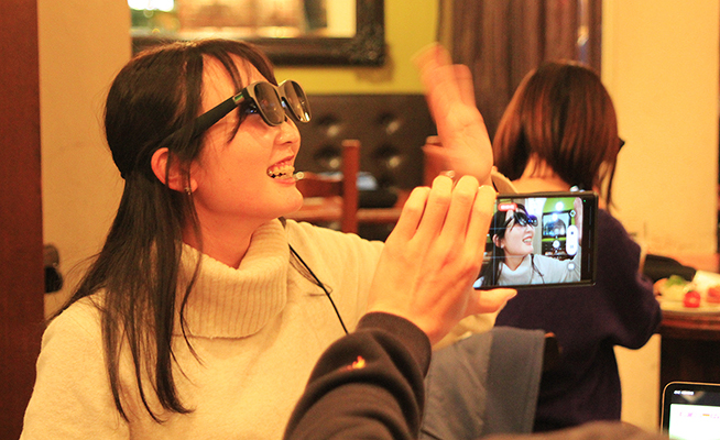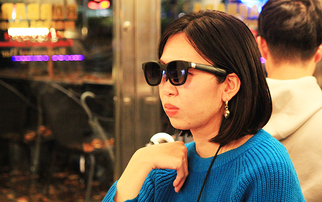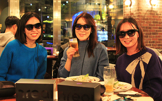 初めて Nreal Air を体験した女性たちは、「迫力ある映像とサウンドでゲームに没入できるうえに、となりに座る友だちとも会話できて、テーブルにあるビールや前菜・オードブルも視界に入って、普段どおりの飲食もできる。これは新鮮」とすでに夢中に。