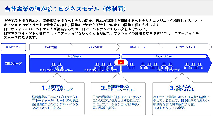 2つめの強みは、ビジネスモデル。前述のように、上流工程を担う日本と、開発実装を担うベトナムの間を、日本の商習慣を理解するベトナム人エンジニアが橋渡しをすることで、オフ ショアのデメリットを最小限にし、開発の上流から下流までのすべての開発工程を完結できる。