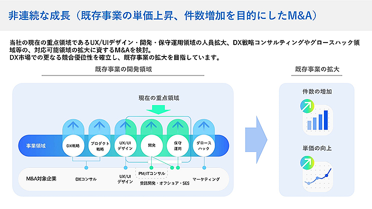 同社は今後、現在の重点領域であるUX/UIデザイン・開発・保守運用領域の人員拡大、DX戦略コンサルティングやグロースハック領域などの、対応可能領域の拡大をめざし、M&A も積極的に検討していくという。