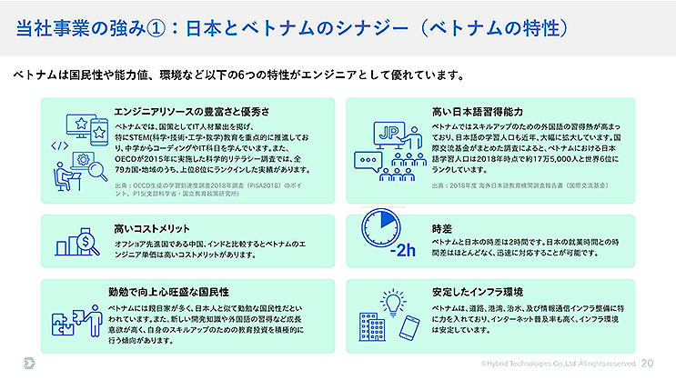 「まずは、日本とベトナムのシナジー。インドや中国にはない、ベトナム人エンジニアの優秀さ・豊富な経験に加え、高い日本語能力、人月単価のコストメリット、2時間という小さな時差などで、ハイブリッドテクノロジーズが選ばれている。