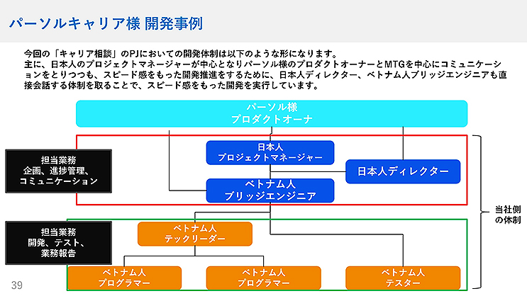 「ハイブリッド開発においては、コミュニケ―ションの仲立ち役である、日本人PMとベトナム人PMの豊富な経験から、従来のオフショアでありがちなコミュニケーションのくい違いなどを解消している。