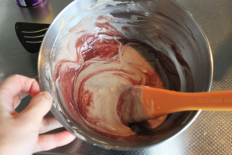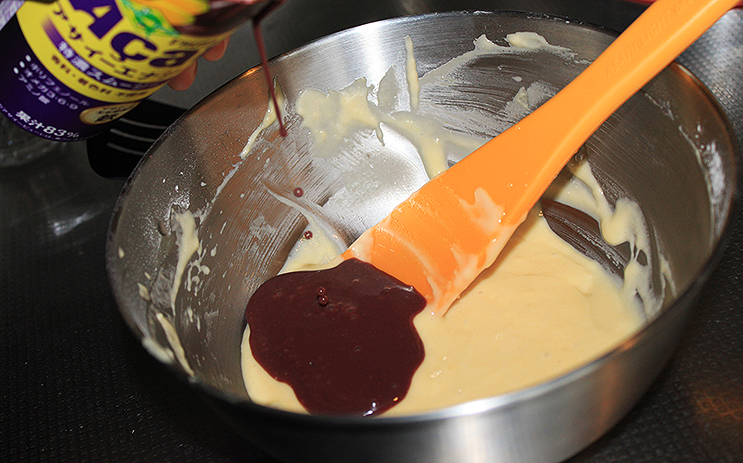 ホットケーキミックスに分量どおり材料を入れてタネをつくったら、「アサイーエナジー」を適量入れて、混ぜて、焼くだけ。