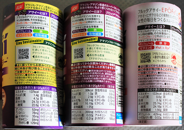 今後のまとめ買いも想定して、どのタイプがいちばん自分好みか、まずはフルッタフルッタのアサイードリンクシリーズ3種を実際に試してみた。