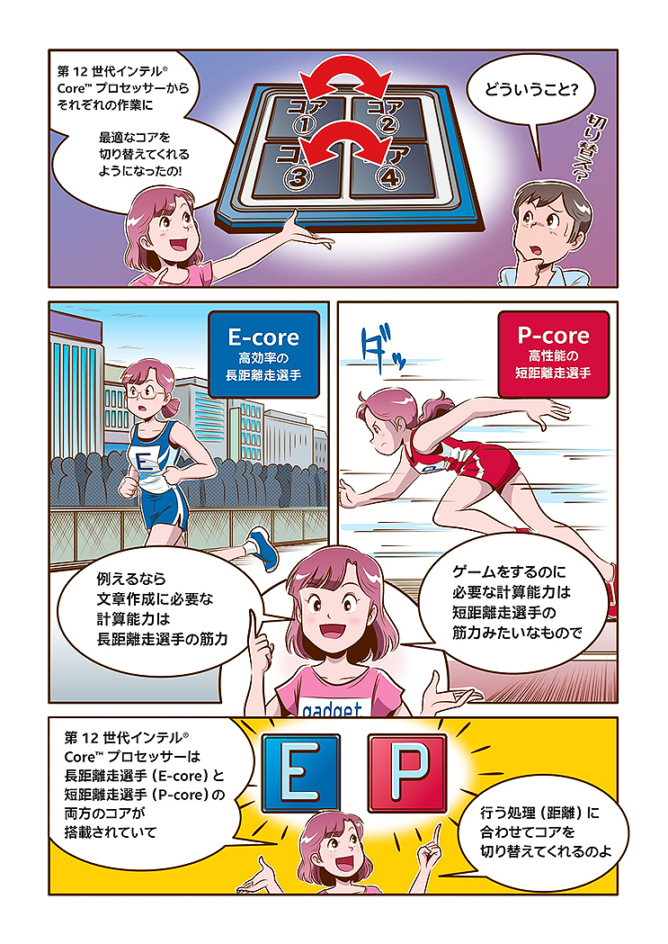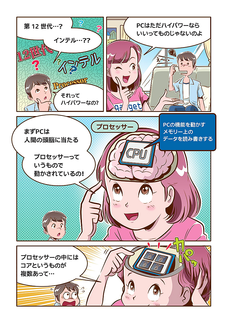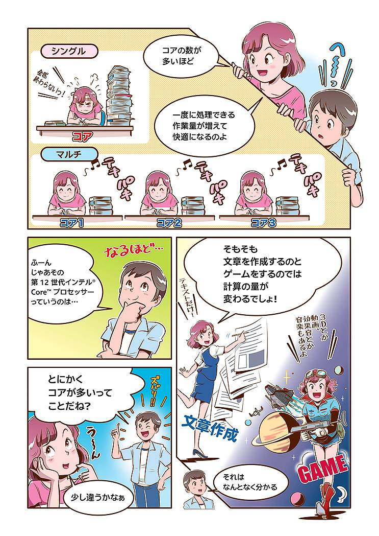 その進化をわかりやすく説明し、快適なパソコン生活を楽しむためのモデル選びのコツを伝えるべく、第12世代・第13世代インテルCoreプロセッサー以降に搭載されている最新技術の特長やメリット、過去の製品との違いを描いたマンガも公開されたから、気になる人はチェックしてみて↓↓↓