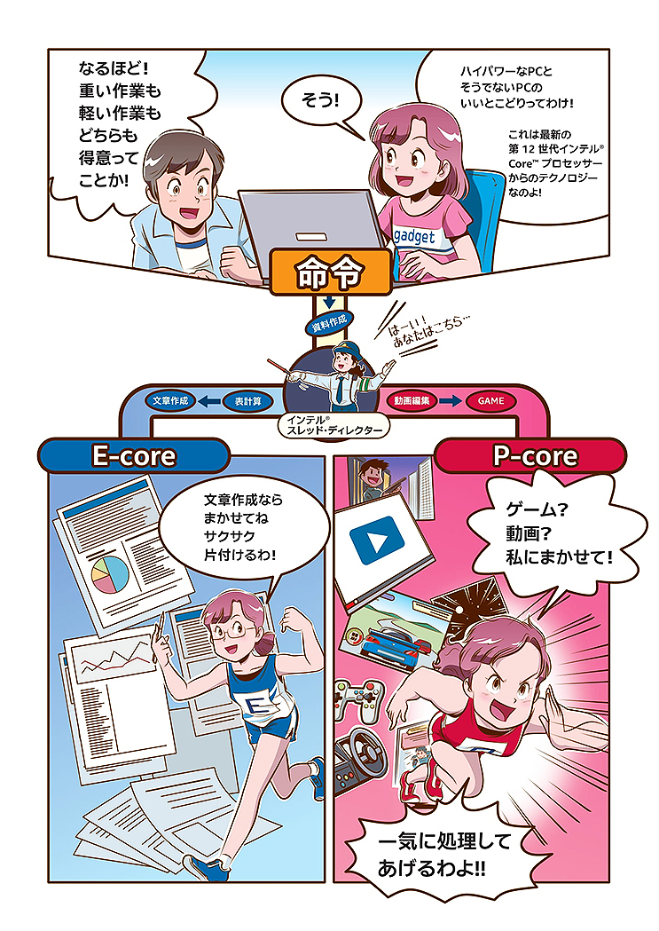内覧会に加え、快適なパソコン生活を楽しむためのパソコン選びのさいの参考として、第12世代 インテルCore プロセッサー以降に搭載されている最新技術の特長やメリット、過去の製品との違いをわかりやすくマンガで解説した。