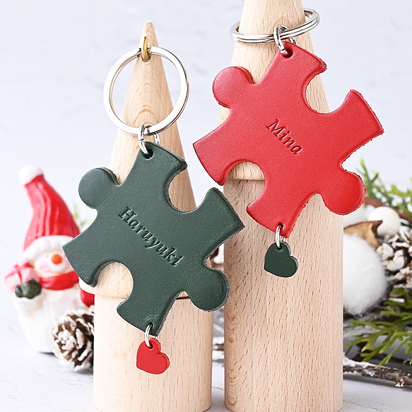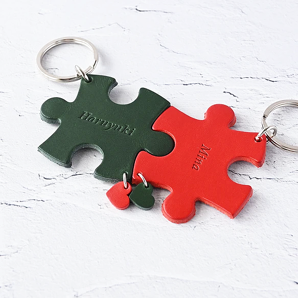 組み合わせるとパズルのようにつながるキーホルダー。名前を入れたり、無しでもオーダーでき、2人だけの特別なアイテムに!イタリア産の牛革の上質さもうれしい。