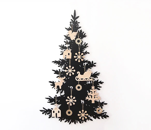 木材の平板をツリー型に切り出した、壁に貼れるツリー。オーナメントを付けることもでき、省スペースでOK。