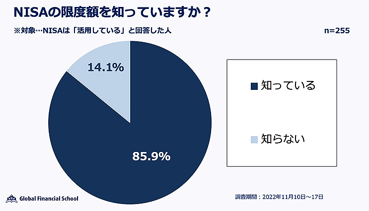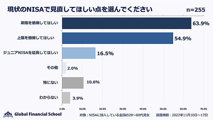 これについて、グローバルファイナンシャルスクールが全国 20〜60代の男女 1039人にアンケートをとったところ、NISA 利用者の見直し要望は 85.5%、 最多は「非課税期間の撤廃」63.9%も。また、NISAを活用している人のなかで、NISAの投資上限額を知っている人は85.9%で、1割程度の人が上限を知らずに NISAを利用していることがわかった。