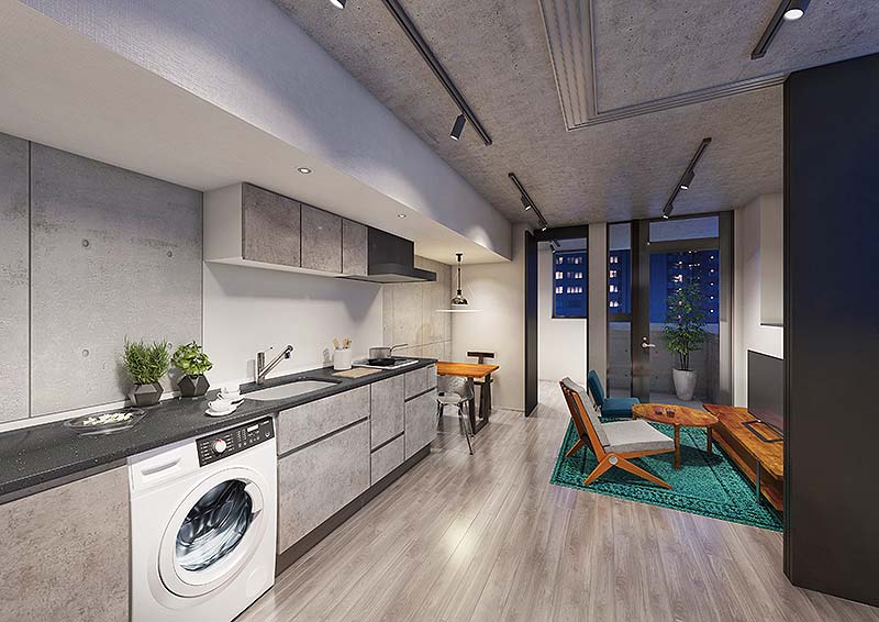 分譲マンション仕様のキッチン、ドラム式洗濯機を標準装備