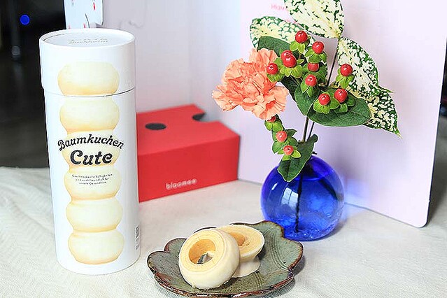 実際に忙しい年度末の3月をいっしょに乗り越えてくれた妻へ「ありがとう」という気持ちを込めて、妻に内緒で「ユーハイムのバームクーヘンキュート(プレーン)×ブルーミーのお花セット」をネット注文。