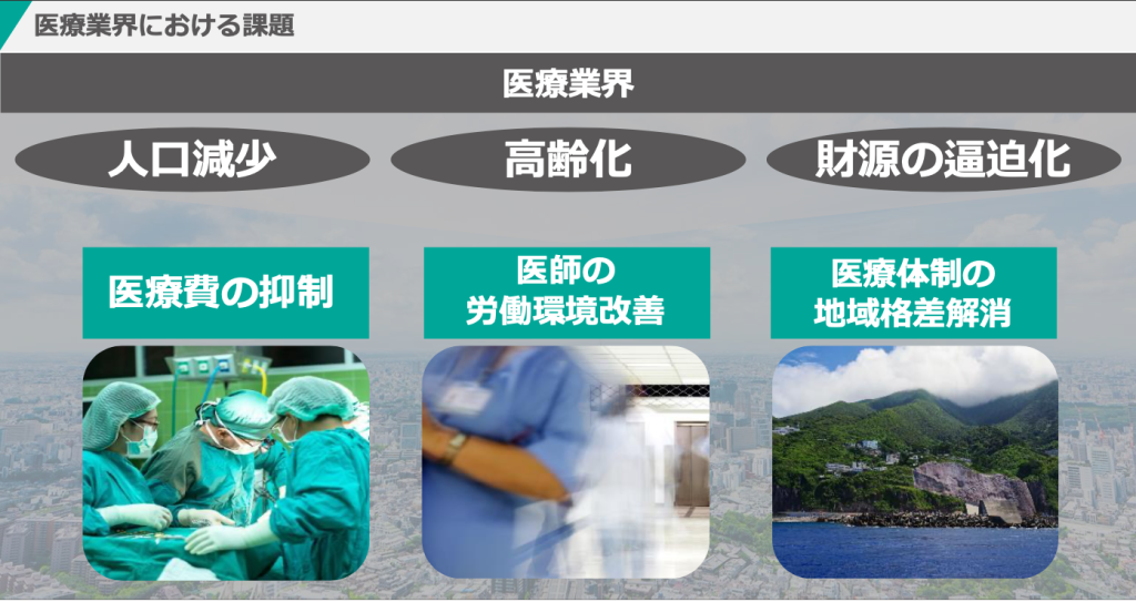 発表会当日は厚生労働省室長補佐の経歴を持ち、現在はデジタルハリウッド大学大学院特任教授や東京医科歯科大学医学部臨床教授などを兼任している加藤浩晃医師も登壇。「日本の疾患構造は感染症から生活習慣病や老化に伴う疾患中心に転換している。特に医療費は3分の1が糖尿病や高血圧性疾患と言った生活習慣病」とし「勤務医の働き方に関しては、2024年4月から医師の働き方改革が本格化するため、早期に対策が必要」と語りました。