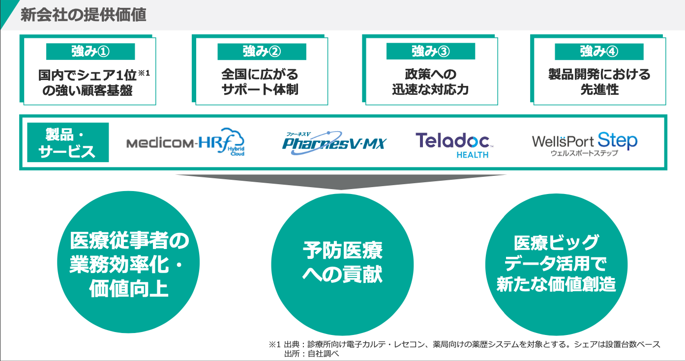 壇上に立った大塚社長は「PHCグループは診療所向けの電子カルテシステムとレセプトコンピューター、電子薬歴システムでシェアナンバー1を獲得している医療DXのパイオニア。この強みを生かして医療業界の諸問題を解決していく」と、新会社設立の背景を語りました。