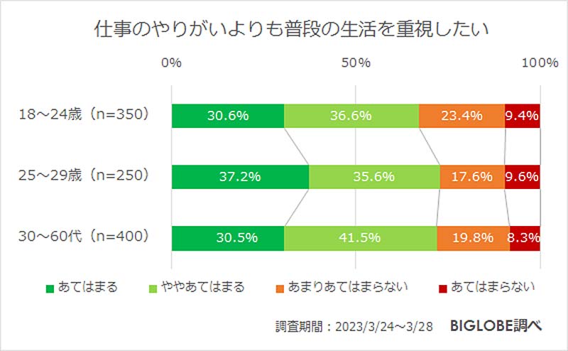さらに「仕事のやりがいよりも普段の生活を重視したい」については、18~24歳のZ世代では、「あてはまる」(30.6%)、「ややあてはまる」(36.6%)をあわせ67.2%と、約7割が「仕事のやりがいよりも生活重視」と考えていることが明らかに。