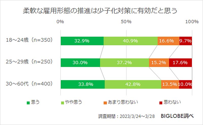 全国の18歳から29歳までの若年層の男女600人と、比較対象として全国の30歳から69歳の男女400人に、「柔軟な雇用形態の推進は少子化対策に有効だと思う」か質問をすると、「思う」(32.9%)、「やや思う」(40.9%)をあわせ、18~24歳のZ世代の7割強が「有効だと思う」と回答した。