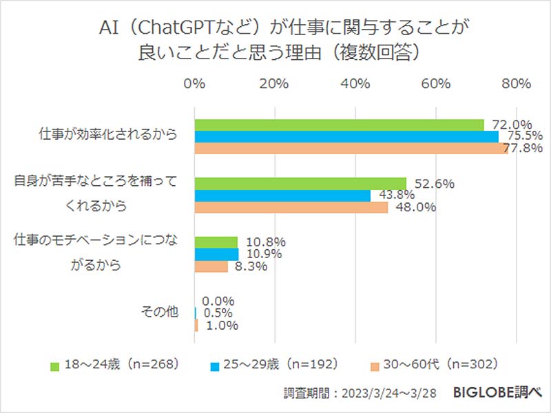 その理由について、質問をすると「良いと思う」理由では、幅広い年代で「仕事が効率化されるから」が約7割、「自身が苦手なところを補ってくれるから」が約5割に。