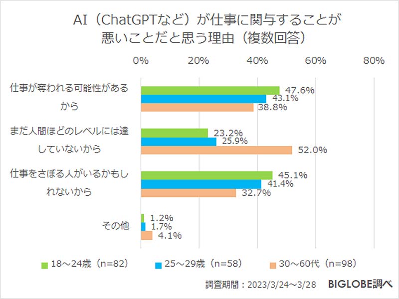 「悪いと思う」理由では、18~24歳のZ世代では、「仕事が奪われる可能性があるから」、「仕事をさぼる人がいるかもしれないから」が約5割に、30代~60代では「まだ人間ほどのレベルには達していないから」が約5割だった。