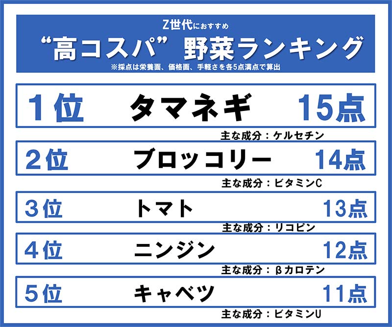 そしてZ世代新社会人の悩みを解消する、高コスパ野菜として、第1位にタマネギ、第2位ブロッコリー、第3位トマト、第4位ニンジン、第5位キャベツが選ばれた。
