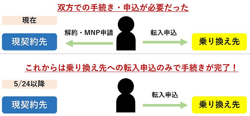 これまでは元のキャリアから MNP 予約番号を取得し、現契約のキャリアに MNP 転出を申請する必要があった。